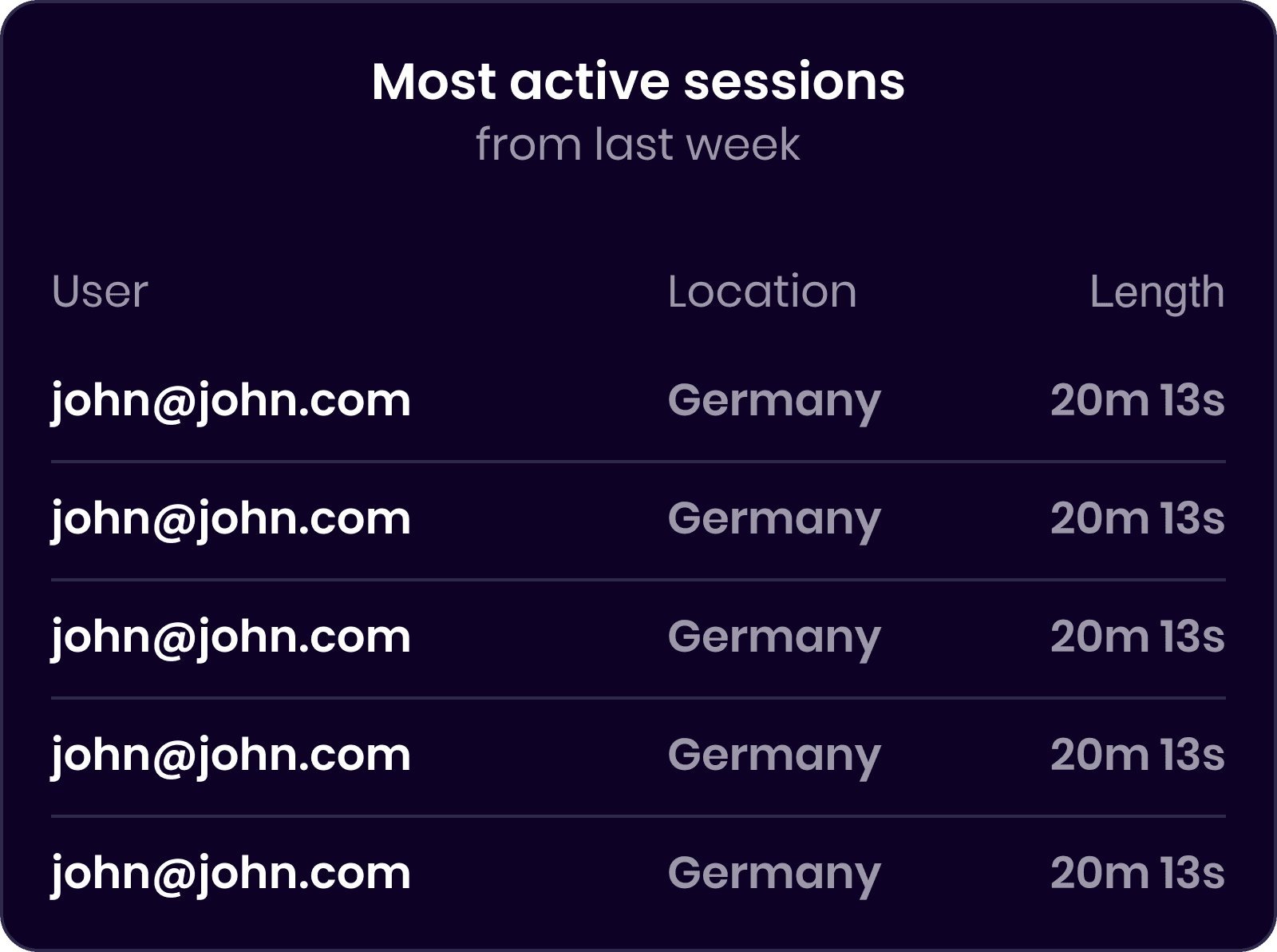 The Sessions Insights digest lists the top 3 most interesting sessions for the week. These sessions are chosen by looking at the user journey in each session, and calculating which journeys are the least likely. These sessions tend to show users who may be frustrated or are using the app in unexpected ways.